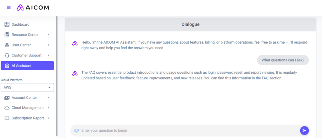 AICOM® AI Assistant provides intelligent assistance across every aspect of cloud management: