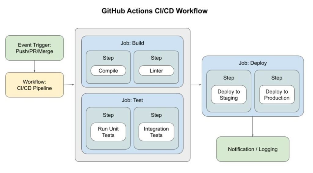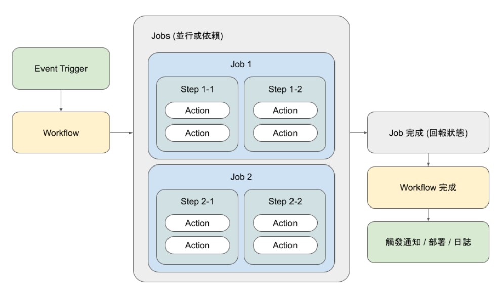 一個 workflow 包含一個或多個 jobs,每個 job 在獨立的虛擬環境中執行,Jobs 預設是並行執行,也可以設定相依關係讓它們依序執行。支援矩陣策略(matrix),可一次針對多種環境組合執行測試,並能設定 Job 依賴確保執行順序更靈活。