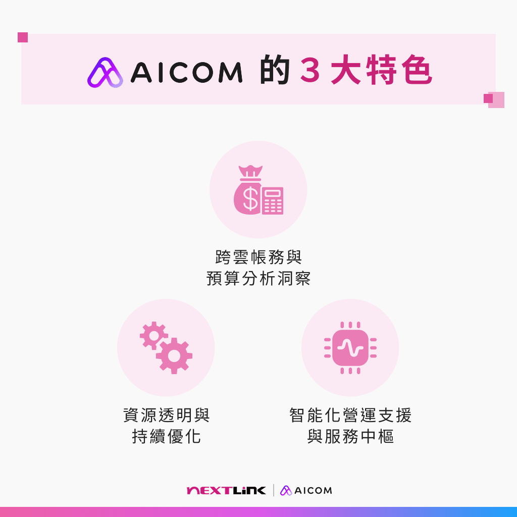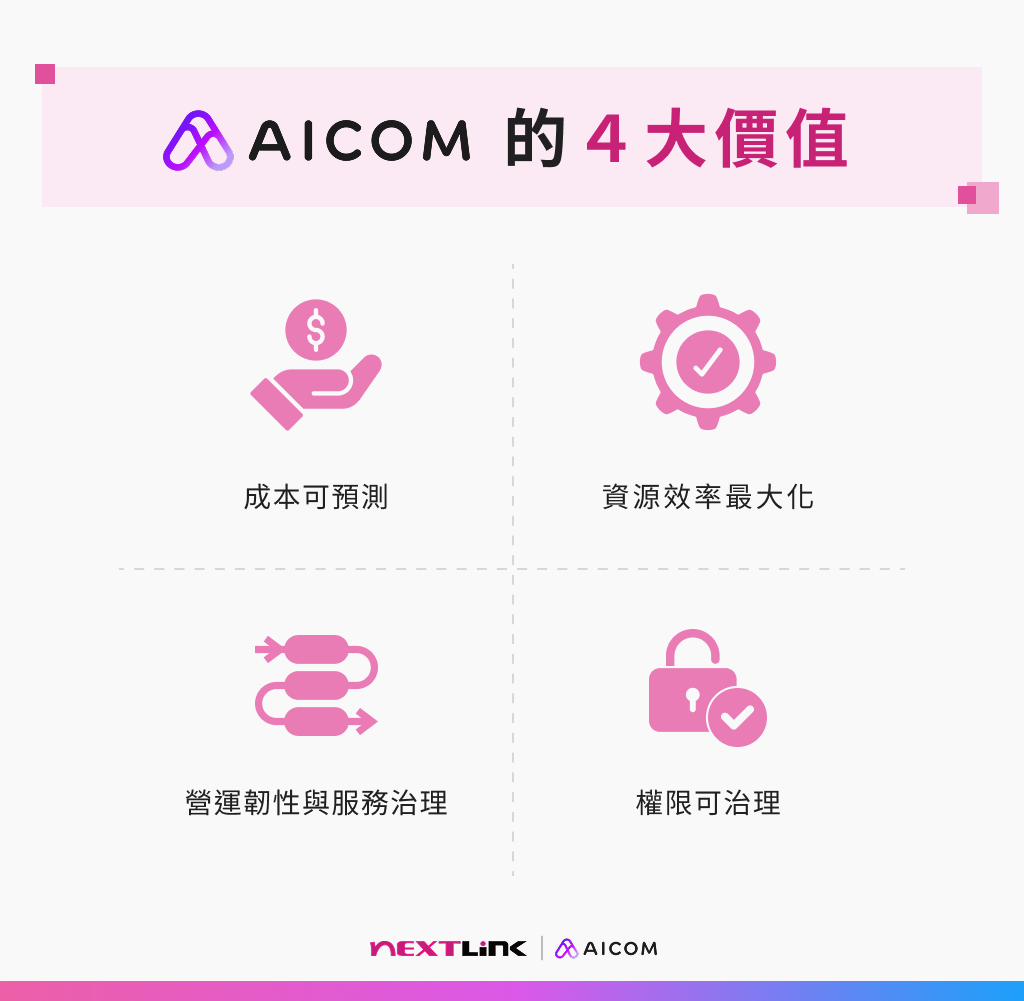 針對企業在雲端管理上困擾的 3 大問題「成本難控」、「資源冗餘」與「營運中斷」,AICOM® 提供了精準的解決方案:
